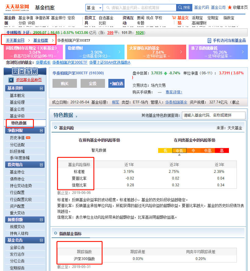 以上这些指标我们可以通过天天基金官网查询,如图所示,进入官网——基金档案,除基金的基本信息外,基本资料一栏中的特色数据,提供以上指标数据查看。