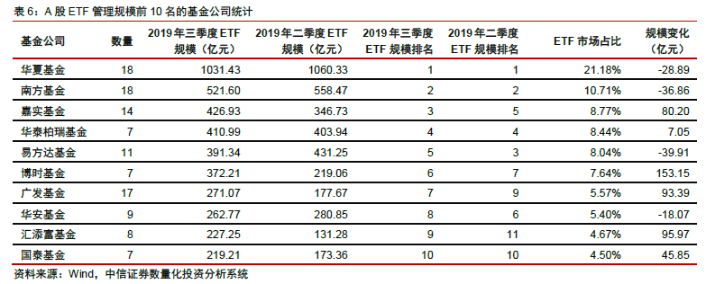 截至 2019 年三季度末,39 家 ETF 管理人中,管理规模前 10 名的基金公司指数基金 规模合计 4134.81 亿元,占所有 ETF 规模 85%,略低于 2019 年二季度的 89%。从管理 规模变化看,2019 年三季度 ETF 管理规模增长前三名的基金公司分别为博时、汇添富和 广发基金,分别增加 153 亿元、96 亿元和 93 亿元。此外,嘉实、汇添富和广发基金的规 模排名均提升了两个名次。