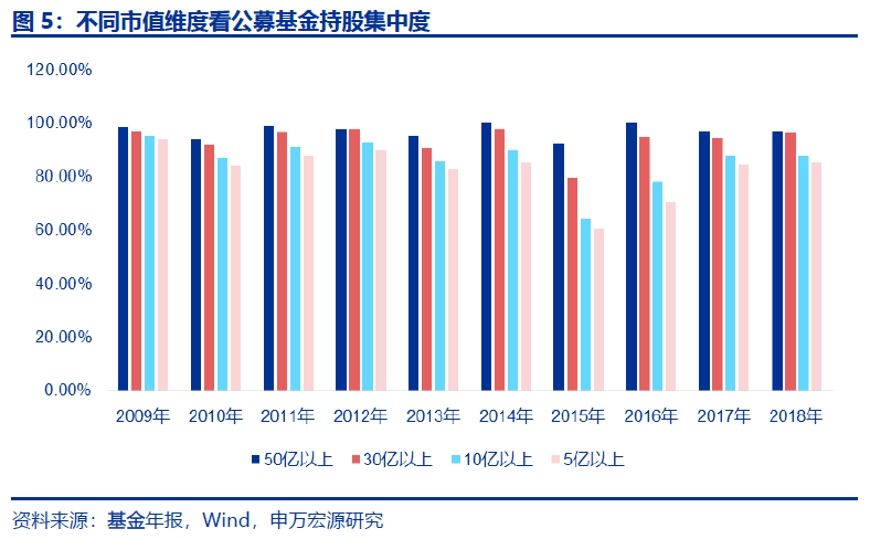 分市值维度来看,公募基金重仓持有的公司集中度更高。最近 10 年以来,公募基金合计持股 50 亿以上的公司,中证 800 成分股市值占比接近 100%,即便风格漂 移最为明显的 2015 年,其占比也在 92%以上。