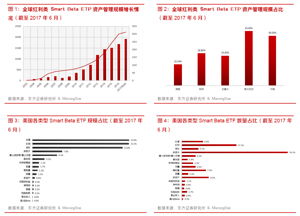 •红利策略是全球市场Smart Beta产品中最常使用的策略之一。在美国、欧 洲、加拿大及亚太四大地区,红利类Smart Beta ETP的资产管理规模在各主 流Smart Beta策略产品中均排在首位,占比基本在30%以上。