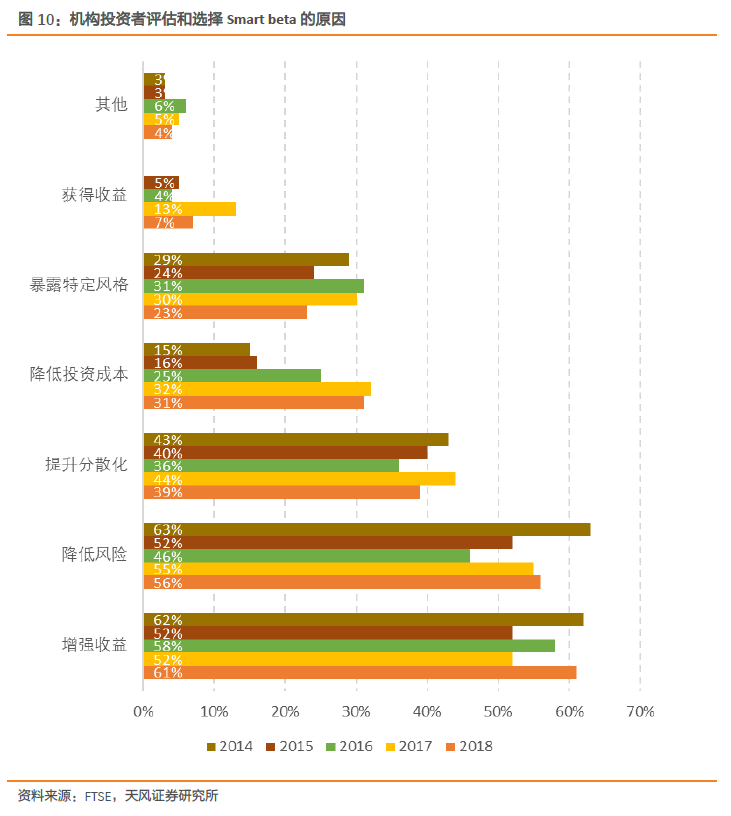 Smart beta 策略的目的在于增强收益、降低风险或提升分散化程度,这也是 Smart beta 策略的吸引力所在。根据 FTSE 发布的《Smart beta:2018 global survey findings from asset owners》,机构投资者初始评估和选择 Smart beta 产品的主要原因是增强收益、降低风险、 提升分散化、降低投资成本、暴露特定风险等。此外 Smart beta ETF 还能带来透明度高、 交易便捷等好处。