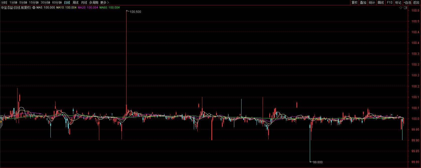 其他货币ETF则类似场外货币基金,净值永远为1,收益每个月结算一次,以新的基金份额形式下发,所以我们看到的K线成水平线走势,基金价格始终围绕100上下波动。