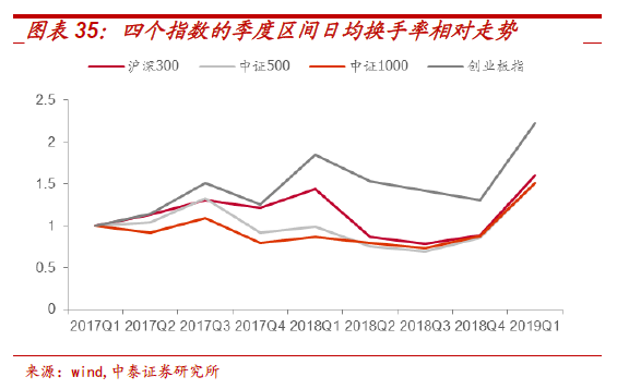 换手率是评估市场关注度的重要指标。以四个指数2017年以来每个季度的区间 曰均换手率相对走势来看,创业板指是目前最热门的指数,而其他三个指数处于 相对较“冷”的阶段。