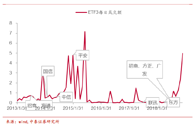 图表12看,各家ETF日均成交额的排名比较固定。ETF3在2018年出现了 逆势增长,这与做市商的引入是密不可分的。图表13展示了 ETF3引入做市商 之后成交额的变化。