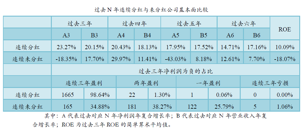 根据中证指数公司的统计数据,过去三年连续分红的上市公司,其净利润复合增长率和营业收入复合增长率都要显著高于过去三年连续未分红上市公司,说明连续分红的公司成长性要高于连续分红公司;连续分红的公司的ROE为(10.09%)显著高于连续未分红公司(-18.07%)。