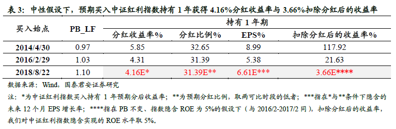 1) 中性假设:取 wind 预测,当前买入并持有 1 年预计得到的分红收益 率为 4.16%;取分红比例假设为 31.39%,与 2016/2-2017/2 相同;要达 到 4.16%的分红收益率,隐含着对中证红利指数未来 12 个月 EPS 增长 率为 6.61%,我们认为具有一定的合理性;最后,假设 12 个月后指数 PB 与当前保持相同、实现 5%的 ROE 水平,则还可获得扣除分红后的 收益率 3.66%。