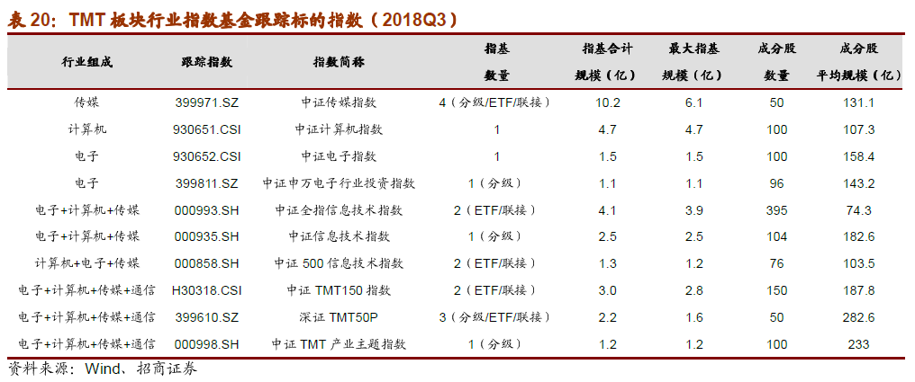 截至2018年Q3,市场中共有18只TMT板块的行业指数3指数;其中6只为分级基金,5只为ETF。