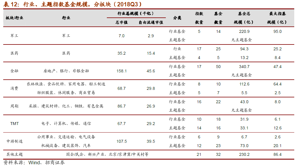 从板块/行业整体体量来看,截至2018年三季度金融板块总市值规模占全市场的30%, 金融行业指数基金合计规模也最大,达340.7亿元;由于短期配置价值显著,军工行业 总市值规模仅占全市场的1.3%,行业指数基金合计规模达220.9亿,占军工行业总流 通市值(2,862 亿,2018Q3)近 8%。