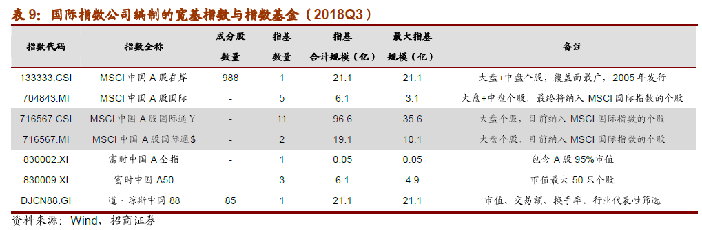 由于存在投资者准入限制,本文中将港股指数归类为国际指数。截至2018年三季度末, 共有58只国际指数基金跟踪港股指数、美股指数等36只国际指数,合计规模318.7亿。