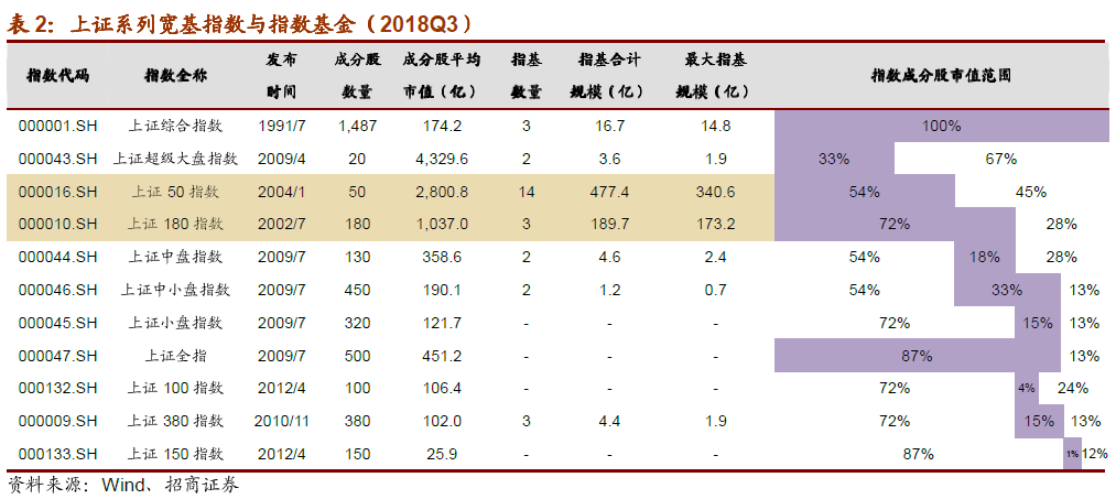 截至2018年三季度末,国内有221只宽基指数,总规模3,144.1亿元;最大的宽基指数为华夏上证50ETF,规模413.1亿元。