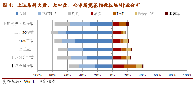 与中证全指指数相比,上证综指中金融板块权重更高,消費、TMT板块和医药行业权重更低,凸显了上交所个股的特点。