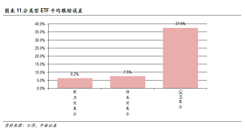 按照投资类型来看,股票型 ETF 平均跟踪误差(2018 年 8 月-10 月,日频对数收益率)为 6.2%;债券型 ETF 平均跟踪误差为 7.5%;QDII 基金由于跟踪外围指数,误差更大,平均为 37.6%。