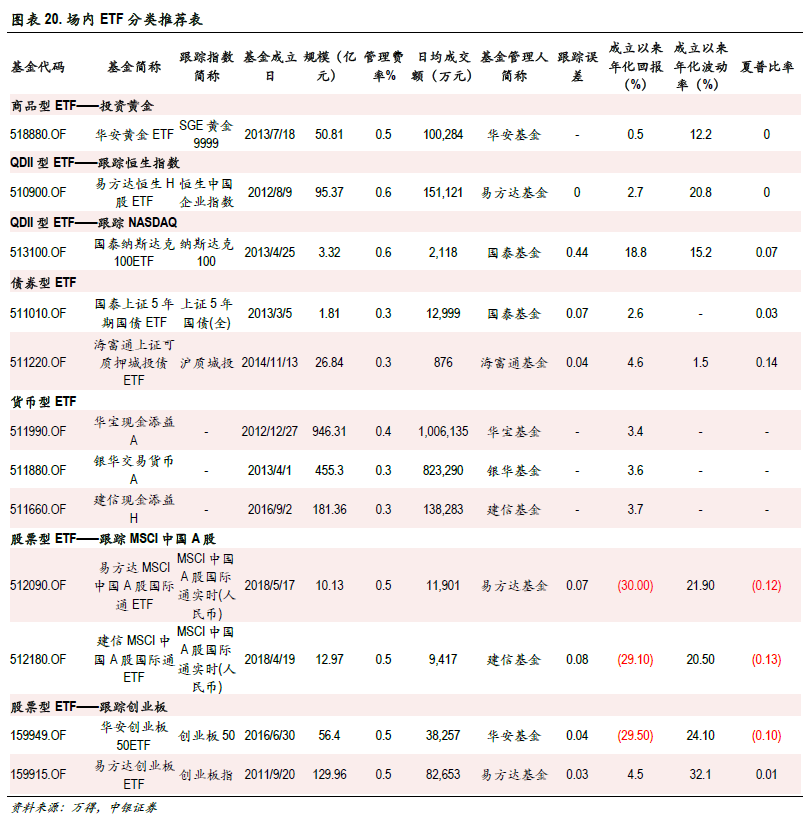 我们按照投资类型,对所有场内 ETF 进行了投资特征一览以及推荐表,便于投资者使用。