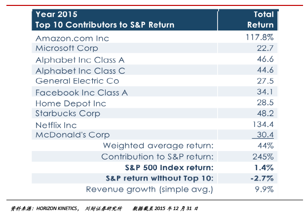 图 10: 2015 年标普 500 指数成分股中涨幅最大的前十只股票