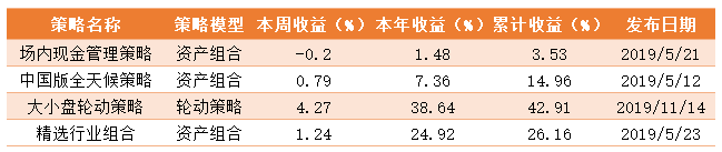 本周除现金管理策略受债券ETF下跌影响收跌外,其余三只策略全部取得正收益。大小盘轮动策略更是获得4.27%收益,本年收益达38.64%。