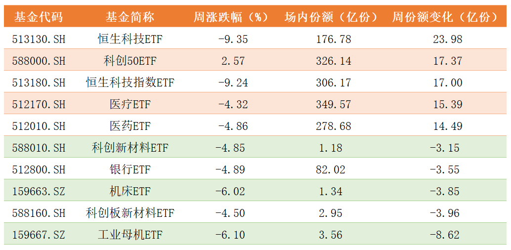此外,股票型ETF仍旧是本周ETF份额大增的主力,15只ETF份额增长超过1亿份。其中,恒生科技ETF、科创50ETF、医疗ETF等4只产品份额增长超过15亿份,份额增减前五标的如下所示:
