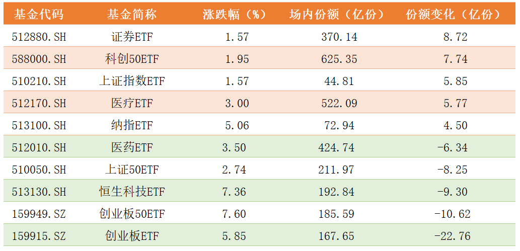 本周大涨的创业板、恒生科技相关ETF趁着涨势资金玩起了落单为安,三只ETF份额流出超过40亿份,其余标的份额变化不大,详细数据如下: