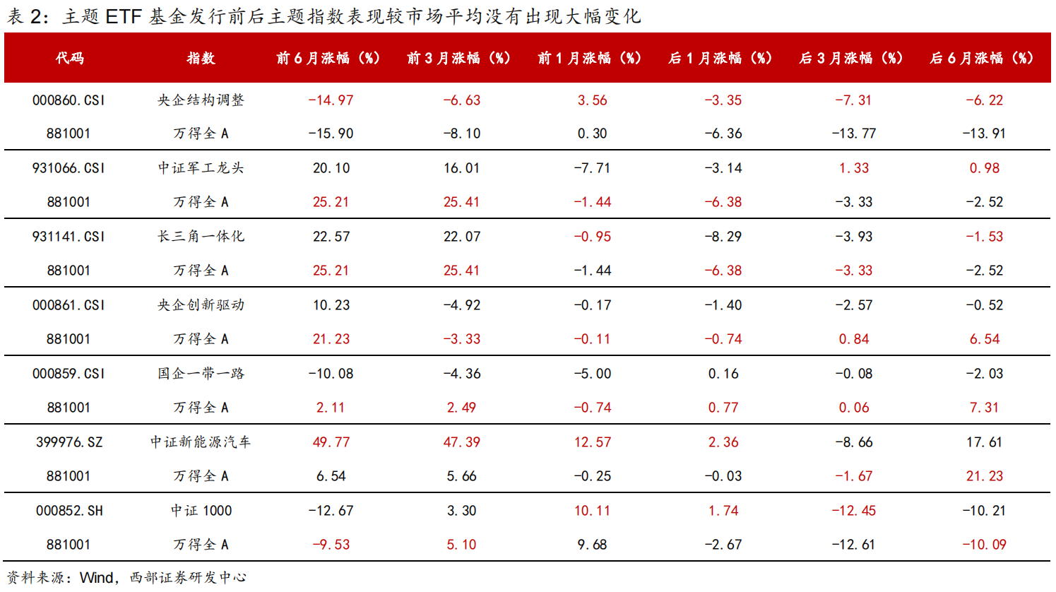 直接给结论,ETF发行后短期内(1个月)主题指数对比万得全A有超额收益(除长三角一体化指数),而更长周期来看(6个月)主题指数涨跌幅跟大盘较为接近。