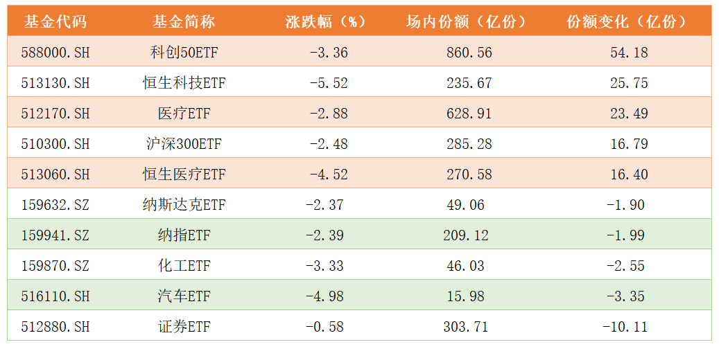 进一步看,资金加仓的标的与上周如出一辙,科创50ETF、医疗ETF、恒生科技ETF份额增长超过20亿份,千亿规模的沪深300ETF(510300)吸金能力持续,详细数据如下: