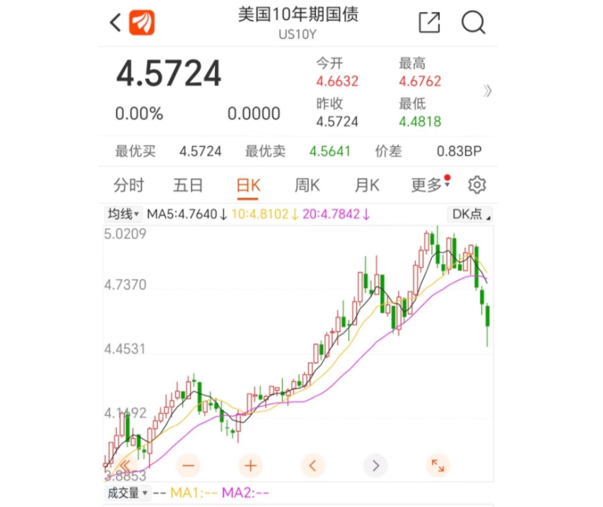 导致的连锁反应就是美债的高收益难以维系,周五10年期美国国债收益率一度跌幅超过10个基点,是近一个月来首次盘中下破4.50%。