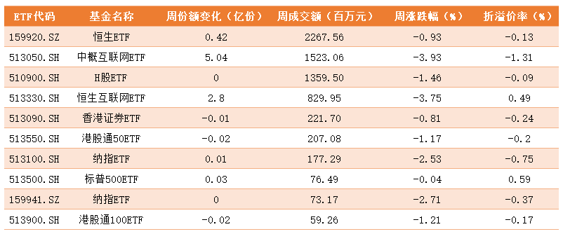 本周跨境ETF跌多涨少,5只跟踪日本股市的ETF全部收涨,其余产品全线下跌。其中,恒生医疗ETF、中概互联ETF、恒生互联网ETF跌幅超过3%,日均成交额前十产品如下所示: