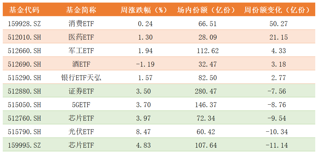 ETF份额方面,近六周股票类ETF连续流出,本周总份额减少22.1亿份。此外,本周消费ETF(159928)份额增加50.27亿份并非实际资金流入,而基金本身份额拆分导致(1:4拆分),如此可见实际上本周ETF市场的份额总流出比账面所反映的更多。